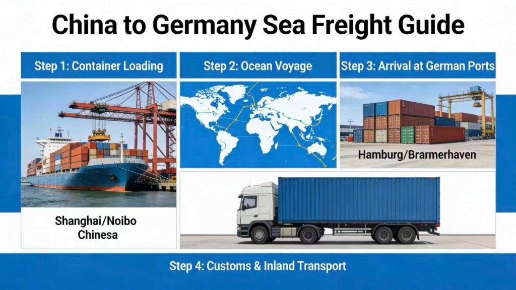 Sea freight is the most cost-effective option for large or heavy cargo. FCL and LCL shipments typically arrive at major German ports such as Hamburg and Bremerhaven within 30–40 days, making it ideal for furniture, machinery, and general cargo.