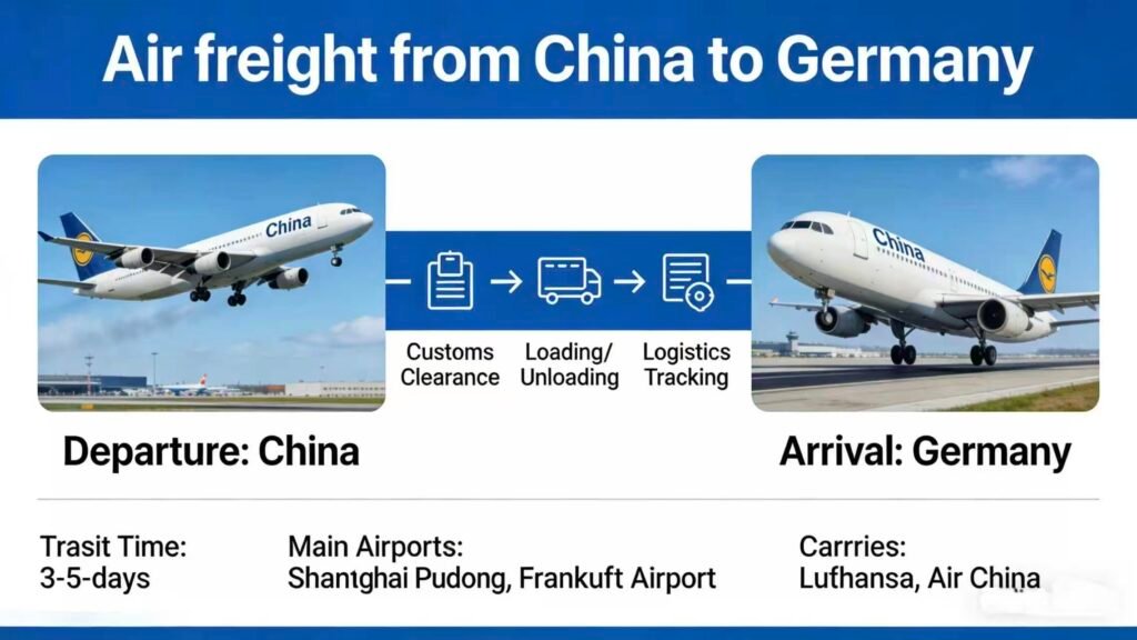 Air freight is preferred for urgent or high-value goods, with 5–8 days door-to-door transit via hubs like Frankfurt (FRA) and Munich (MUC).