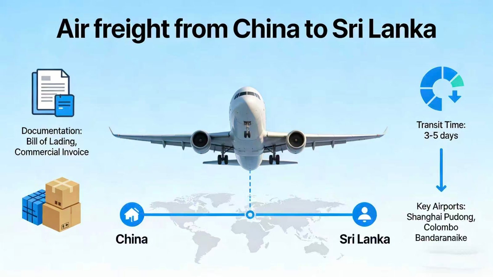 Air freight offers one of the fastest shipping options when moving cargo from China to Sri Lanka, especially for high‑value, urgent, or time‑sensitive goods. Standard air cargo services from major Chinese airports such as Shanghai Pudong (PVG), Guangzhou Baiyun (CAN), Beijing Capital (PEK) and Shenzhen Bao’an (SZX) to Bandaranaike International Airport (CMB) in Colombo typically transit in about 3–6 days, depending on flight availability, airline schedules, and seasonal demand.